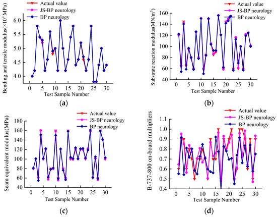 JS-BP and BP neural network model prediction results: (a) Bending and tensile modulus, (b) reaction modulus at top of the subgrade, (c) seam equivalent modulus, and (d) aircraft load multipliers.