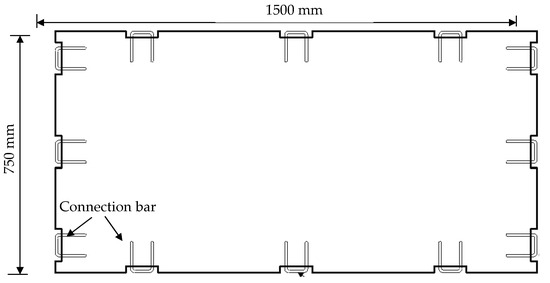 Nine reinforced concrete (RC) prefabricated pavement panels were prepared with a thickness of 120 mm and a plane dimension of 750 mm × 1500 mm, as shown in Figure 11. The geometric scale factor is 3:10 compared with the actual panel size. The diameter of the reinforcement bars is 8 mm, with a yielding strength of 400 MPa. These bars are arranged in a double-layer bi-directional configuration with a spacing of 90 mm. The depth of the protective concrete layer is 15 mm.
