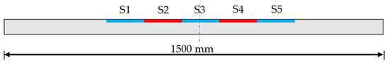 As shown in Figure 2, the maximum strain occurs at the side when the aircraft load is applied at the middle side of the panel, as per the specification, namely, Specification for the Design of Cement Concrete Pavement at Civilian Airports of China. For embedding the FBG sensors into the concrete, the sensors are embedded into one steel bar at first, named the self-sensing bar. Then, the self-sensing bar is directly tied together with the other common steel bars and embedded into the concrete. In the experiments, the gauge length of the FBG sensors is 150 mm. In total, five sensors are installed in one bar, as shown in Figure 12. Theses sensors are numbered S1 to S5. The panel with the self-sensing bar embedded is in the middle part of the pavement model, namely, the fifth panel, as shown in Figure 2.