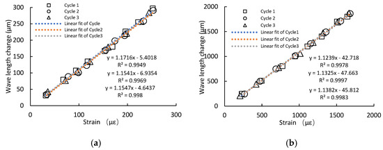 The strain-sensing performance of the self-sensing bar is verified with some static tension tests before its actual application. Three strain cases are set, namely, a small-strain case, medium-strain case, and large-strain case. The small-strain case represents the case before concrete cracking. The large-strain case represents a large-damage case, namely, after concrete cracking. The typical test results are as shown in Figure 13. From the results, a linear relationship can easily be found between the wavelength change and strain, with no influence of the strain cases, indicating that the proposed sensing method can implement the strain monitoring of the whole mechanical life of an RC panel. Meanwhile, an excellent measurement repeatability is evident in the figures, ensuring long-term monitoring accuracy.