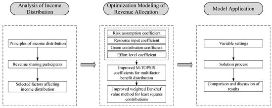 This study unfolds in three steps: First, we analyze the stakeholders and influencing factors in the benefit distribution of the green supply chain for prefabricated construction. Second, we construct an optimized benefit distribution model for the green supply chain of prefabricated construction based on cooperative game theory, including calculating the benefit distribution coefficients under single factors, applying the improved M-TOPSIS to calculate multi-factor benefit distribution coefficients, and using the weighted Banzhaf value model improved by the least squares method—this forms the core of this paper. Lastly, we conduct empirical analysis and result validation. A detailed flowchart of the research process is shown in Figure 1.