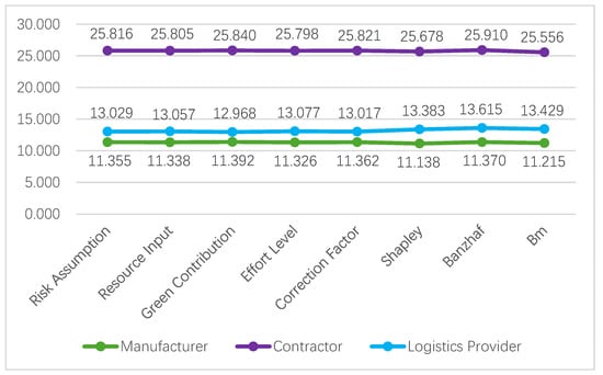 The benefit distribution in the green supply chain of prefabricated buildings is a typical cooperative game problem, which requires the rational allocation of each participant’s contributions and benefits based on their cooperation. Due to significant differences among the participants in terms of risk-bearing, resource investment, technical capabilities, and market influence, and because the synergies among different supply chain links are crucial to the success of the project, the rationality of the benefit distribution directly impacts the overall project efficiency []. The Shapley and Banzhaf values are suitable for such distributions because these methods allocate the total cooperative benefits based on each player’s marginal contribution, better reflecting each segment’s contribution within the green supply chain and increasing the fairness of the distribution and the satisfaction of the participants []. Benedek (2024) [] studied the benefit distribution model in large-scale international kidney exchange programs and found that the Shapley value, Banzhaf value, and nucleolus value have unique advantages in handling contributions and interests of different countries, especially suited for complex environments that require the consideration of heterogeneity and dynamic changes among multiple parties. Similarly, Karczmarz (2022) [] compared the Banzhaf value and Shapley value in attributing characteristics within tree ensemble models, finding that the Banzhaf value, while providing similar attribute attribution, offers better numerical stability and faster computation. Comparative results show that the Shapley value, due to its fairness and symmetry, exhibits significant advantages in the distribution of benefits within the supply chain, particularly suitable for scenarios where there is a large disparity in contributions among cooperators. In contrast, the Banzhaf power index emphasizes the cumulative effect of marginal contributions, possessing unique attributes in explaining feature importance, especially suitable for cooperative environments with many participants and uneven influence. Therefore, it holds an important place in the study and application of supply chain management. In the complex and dynamic cooperative game environment of the green supply chain for prefabricated construction, employing the Banzhaf value can further enhance the efficiency and fairness of benefit distribution.