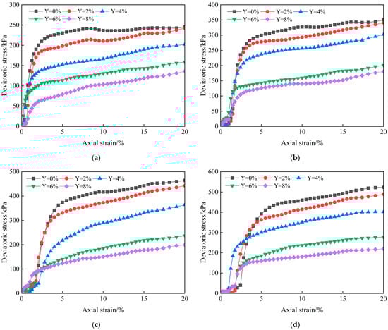 Figure 2 shows the stress–strain relationship curve of red soil under different organic matter contents (“Y” in the figure represents the organic matter content). In this test, the peak deviatoric stress was used as the shear strength of the sample. As shown in Figure 2, under different confining pressures, as the organic matter content increases, the shear strength of the sample decreases continuously. When the confining pressure is 100 kPa, the shear strength of the sample decreases from 244.22 kPa to 118.67 kPa. When the confining pressure is 200 kPa, the shear strength of the sample decreases from 339.21 kPa to 151.53 kPa. When the confining pressure is 300 kPa, the shear strength of the sample decreases from 442.75 kPa to 177.34 kPa. When the confining pressure is 400 kPa, the shear strength of the sample decreases from 493.02 kPa to 206.76 kPa. Regardless of the organic matter content and confining pressure, as the axial strain increases, the increase in the deviatoric stress of the specimen begins to decrease at the axial strain of 2–3%, and the growth trend gradually slows down. The stress–strain relationship curves all show a hardening type. The increase in the organic matter content in red soil changes the particle distribution and soil structure of the red soil. Organic matter forms a film or coating on the surface of soil particles, which will reduce the bonding force and friction between soil particles. As a result, the pores in the soil increase and the soil structure becomes loose. The loose structure makes the soil prone to large deformation when subjected to shear force, resulting in a decrease in the shear strength of the soil.
