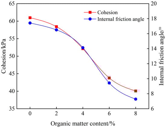 (1) With the increase in organic matter content, the cohesion and internal friction angle of red soil both tend to decrease. When the organic matter content increases from 0% to 8%, the cohesion of red soil decreases from 60.98 kPa to 40.07 kPa, a decrease of 34.29%; and the internal friction angle decreases from 17.42° to 7.28°, a decrease of 58.21%. It can be seen that the effect of organic matter content on the internal friction angle of red soil is more significant than its effect on cohesion.