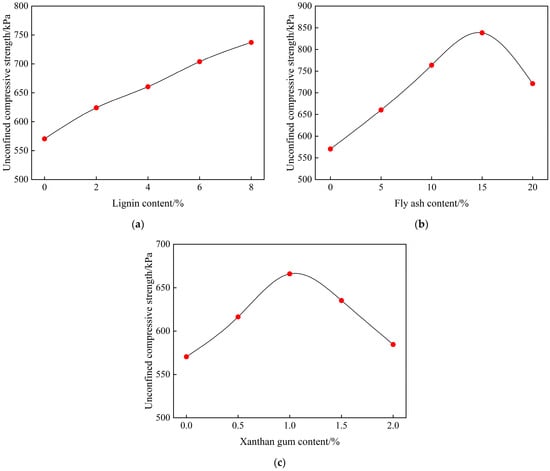 The UCS change curve of organic-matter-contaminated red soil with different gradient modifiers added: (a) lignin; (b) fly ash; and (c) xanthan gum.