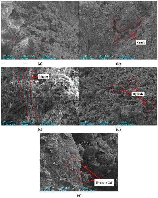In this SEM test, images with a magnification of 1000 were selected for analysis, as shown in Figure 5. Figure 5a is the SEM image of the red soil. It can be seen from the figure that the soil particles are closely connected. The particles are connected in the form of point-to-point, point-to-surface, and surface-to-surface, and their distribution is relatively scattered. At the same time, there are many pores and cracks. Figure 5b is the SEM image of organic-matter-contaminated red soil. As can be seen from the figure, due to the acidification of organic matter, the bonding force between particles decreases. This leads to the appearance of many cracks and pores, and the soil strength decreases. Figure 5c is the SEM image of red soil improved with 8% lignin. It can be seen from the figure that the lignin is in a strip shape and is wrapped in soil particles. Lignin acts as a reinforcement, making the soil particles more closely connected to each other and reducing the number of pores and cracks []. This increases the strength of the soil. Figure 5d is the SEM image of red soil improved with 15% fly ash. It can be seen from the figure that fly ash neutralizes the effect of the organic matter acidification reaction. At the same time, the active silicon and active aluminum in the fly ash react with water in the soil to produce colloidal hydrates. These hydrates will fill the pores and cracks between soil particles, tightly connecting the soil particles together, thereby enhancing the strength of the soil. Figure 5e is the SEM image of red soil improved with 1% xanthan gum. It can be seen from the figure that xanthan gum can absorb water and swell in the soil. Xanthan gum in the soil will promote the exchange of metal ions and the production of hydrated gel inside the soil []. The filamentous gel enhances the bonding between soil particles through stretching, and part of the gel fills the pores to make the soil structure dense, thereby improving the strength of the soil [].