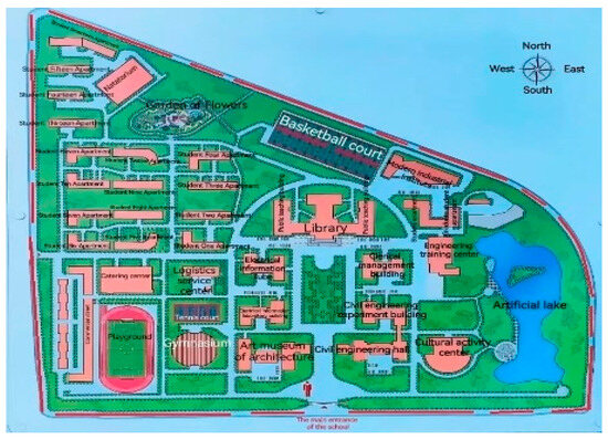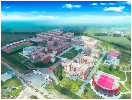 According to the statistics of the official website of the university, during the research period of 2023, the university had 12 colleges, including the College of Architecture and Planning, College of Civil Engineering, College of Digital Construction, College of Management Engineering, College of Creative Design, College of Foreign Languages, etc., with 45 undergraduate majors in five disciplines of “engineering, management, arts, literature and law”. The university had 13,575 students and 1000 teaching staff. The climate zone belongs to the cold region, with a temperate continental monsoon climate, and the climate characteristics are obvious, with an average annual temperature of 4.6 °C. Winters are harsh and long, with the heating season running from October 20 of the current year to 6 April of the following year. The university has a 40-week academic calendar, including spring (March to July) and fall (August to December) classes. The exterior of the building is shown in Figure 1.