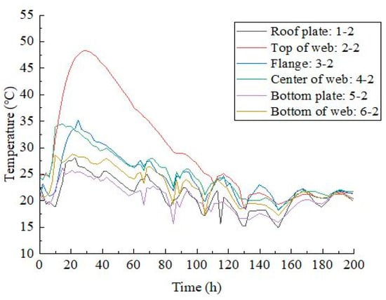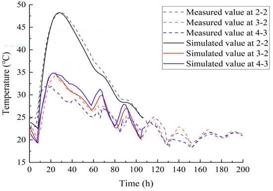 - The monitored maximum temperature shows a positive correlation with the cross-sectional dimensions of the structural member, where the larger the size, the higher the temperature. Meanwhile, the time taken for the concrete temperature to reach the maximum value is essentially proportional to the distance between the measurement point and the member’s surface. The smaller the distance, the shorter the time to reach the peak temperature.