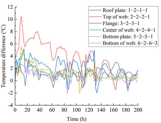 - The measured and theoretical temperature time histories exhibit comparable trends, indicating that the developed finite element model accurately captures the thermal behavior induced by the hydration process in a representative 5 m long segment of the box girder. This finding can provide a foundation for the subsequent analysis of the hydration heat of an 80 m long segment of the prestressed concrete box girder of the Hangzhou Bay Cross-Sea Railway Bridge.