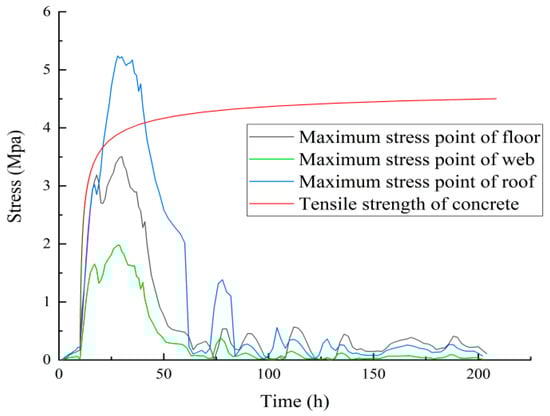 - To effectively prevent structural cracking risks during the concrete pouring and curing process of box girders, a scheme is proposed to maintain principal stress levels consistently below the concrete’s tensile strength threshold. For summer construction with a high concrete molding temperature, implementing strategic ventilation measures within the girder effectively reduces core-surface thermal gradients and early-age tensile stresses, thereby mitigating the initial concrete cracking potential.