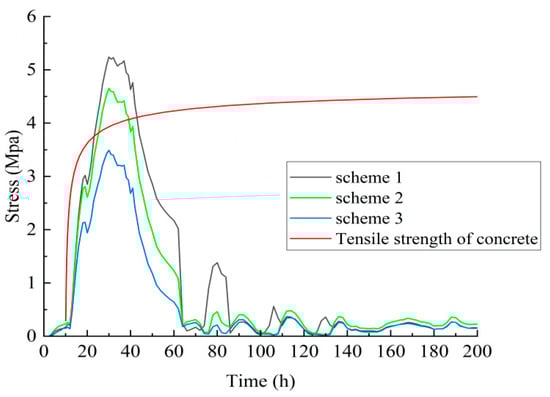 - The corresponding maximum principal stress increases with the temperature difference between the interior and the surface of concrete, demonstrating that hydration-induced differential thermal expansion between the core and surface regions greatly affects the tensile stress.
