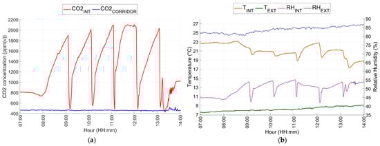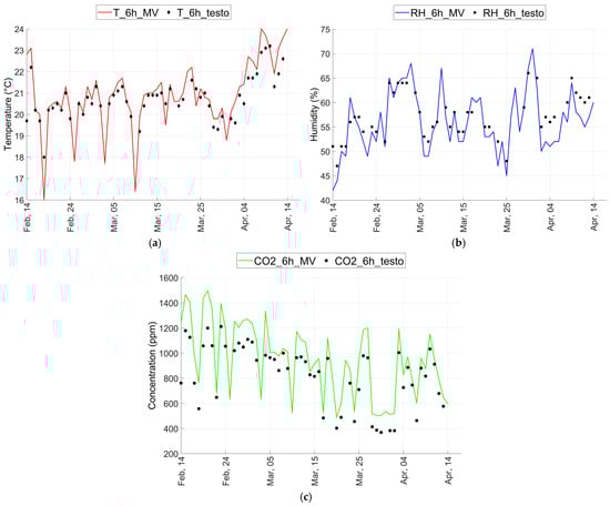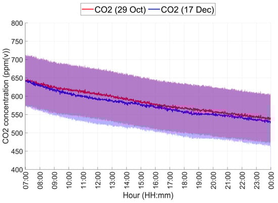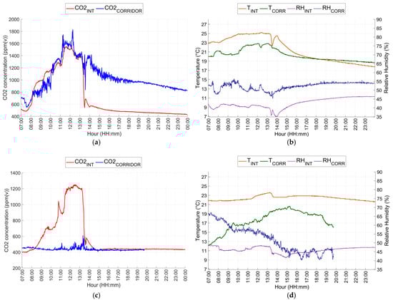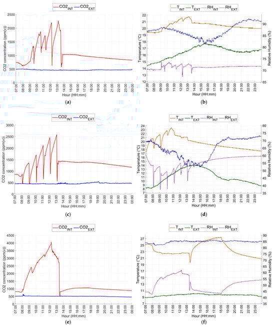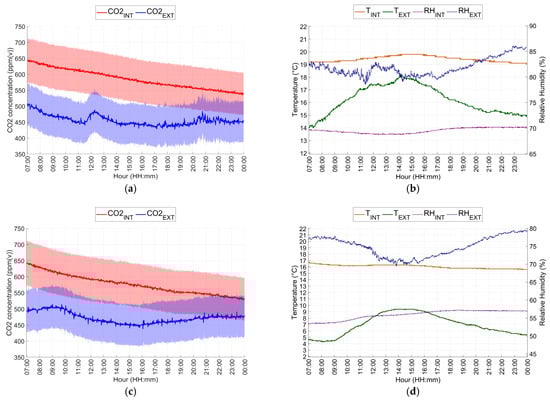 - CO2, humidity, and temperature measurements were obtained from two sensors: one located 1.70 m above the ground and the other near the ventilation machine system’s intake. The average deviations between the two sensors were approximately 0.8 K for temperature, 1% for relative humidity, and 147 ppm(v) for CO2 (Figure 14a–c).
