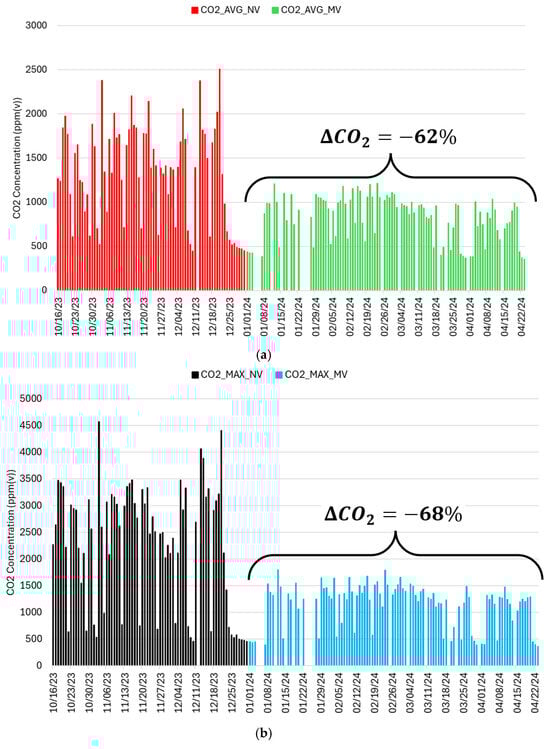 - CO2 concentrations in the classroom dropped significantly with mechanical ventilation, with peak values reaching more than 4500 ppm(v) under natural ventilation and rarely exceeding 1500 ppm(v) with mechanical ventilation. The average concentration during occupancy decreased from around 2500 ppm(v) to levels close to 1000 ppm(v) and a reduction of 62% (Figure 10a, considering mean values during the occupation period), and the daily reduction reached −68% considering the maximum daily values (Figure 10b).