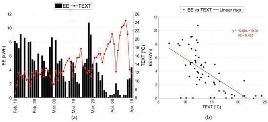 - Energy consumption by the MVHR system varied due to the use of the post-heating battery, mainly depending on external air temperature (R2 = 0.425), as the machine was set to operate at a fixed rate. Daily energy usage ranged from about 1 kWh to 11 kWh over 6 h of operation, indicating the need for variable-rate operation to reduce energy use and avoid excessive ventilation and consumption.