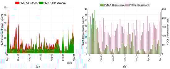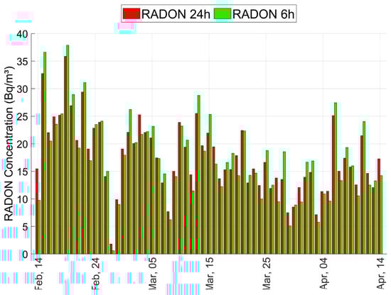 - While the MVHR system demonstrated clear benefits in managing CO2 levels, similar effects were not observed for PM2.5, VOCs, or radon. Throughout the measurement period, indoor PM2.5 levels (daily range 3–39 μg/m3) remained lower than those outside, regardless of whether the machine was on or off. No significant differences were observed in VOC levels between machine operation and downtime, with daily averages between 60 and 370 ppb. Radon levels also showed no significant change with the system on or off, with annual average values around 21 Bq/m3 and peaks reaching 56 Bq/m3 (Figure 12a,b and Figure 13). These effects may be partly attributed to the machine’s operation at neutral pressure, allowing potential pollutant infiltration from outside, even though the system is equipped with an F7/ePM1 70% filter that can capture at least 70% of finer particles, including PM1. The observed indoor PM2.5 levels mirrored those from nearby ARPAE monitoring stations outside the building.