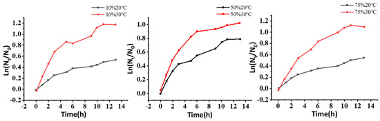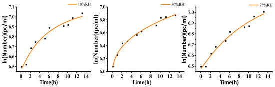 Figure 4 depicts the growth and reproduction curves of Staphylococcus aureus on the surface of activated carbon under temperature conditions of 20 °C and 30 °C, along with relative humidity levels of 10%, 50%, and 75%. Evidently, across all tested temperature–humidity combinations, the population of Staphylococcus aureus exhibits a continuous upward trend over time. Notably, its growth pattern closely adheres to the typical microbial growth model, with a distinct logarithmic growth phase being clearly observable.