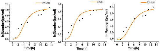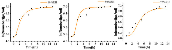 Logistic model fitting curves at 30 °C under 10%, 50%, and 75% RH.