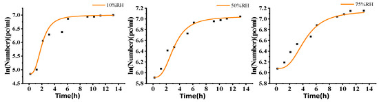 The growth curves of Staphylococcus aureus under temperature conditions of 20 °C and 30 °C, and relative humidities of 10%, 50%, and 75% RH, were fitted using the Gompertz model, as shown in the figures below.