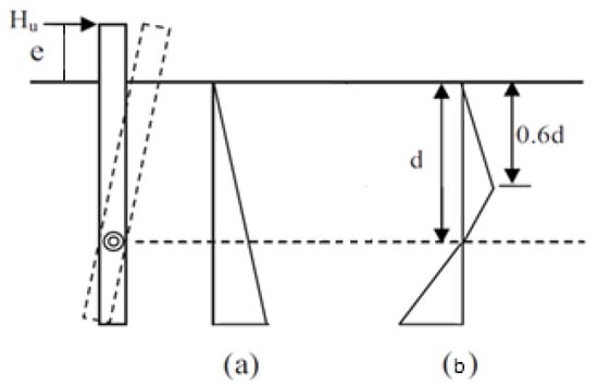 According to the earth pressure theory, Rankine’s passive stress is equal to Kp multiplied by . For laterally loaded piles, however, the lateral soil resistance pu is greater than due to the three-dimensional characteristics of the lateral soil resistance [,]. The ultimate lateral load capacity Hu is obtained from the equilibrium condition of the resultant forces acting on the pile: