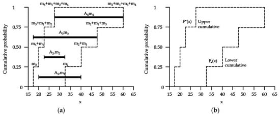 Figure 2 presents the structure of a random set originating from various data given as intervals (i.e., focal elements A1, … An and their basic probability assignments m1, … mn). To draw the appropriate right border, the probability mass for each subset is assumed to be focused at the upper bound of the subset [].