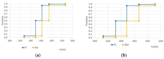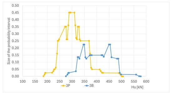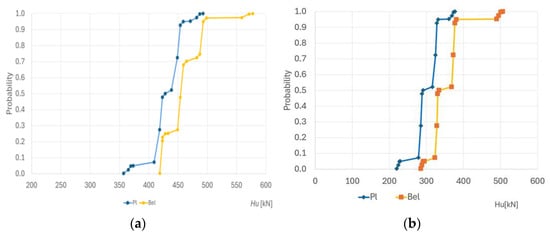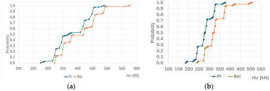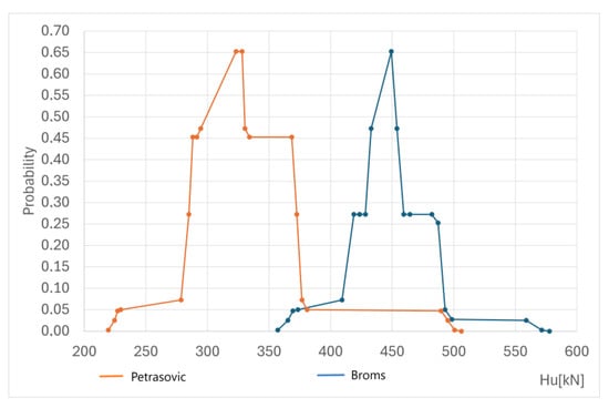 The allowable Hu forces determined by two adopted methods take on different values, as is the case with deterministic calculations. These results are significantly lower than the pile bearing capacity calculated for the average soil parameters within the range shown in Table 6. The above considerations concern the load-bearing capacity of the pile resulting from the soil parameters, but do not take into account the load-bearing capacity and reliability of the pile [] as a structural element in the pile-soil system.
