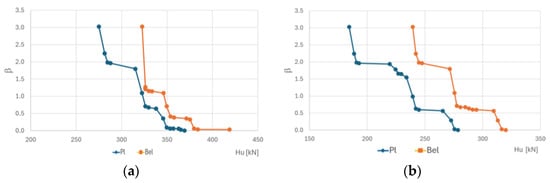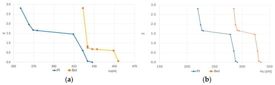Reliability indices: (a) Broms method (3B) and (b) Petrasovit method (3P).