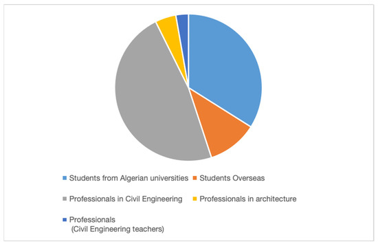 The data were collected from 109 respondents, ensuring a broad perspective from various segments of the Algerian construction sector and academic community. The distribution of respondents by category is shown in Figure 2. This methodological approach enables a comprehensive understanding of the challenges and awareness surrounding sustainable construction in Algeria.