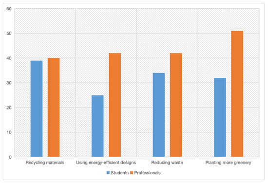 Other responses related to the building process include ways construction can be greener (Figure 6) such as recycling materials (72.48%), continuing to have an energy-efficient design (61.47%), and reducing waste (69.72%). These ideas conform to recognized principles of green building and provide specific actions that promote more environmentally friendly construction.
