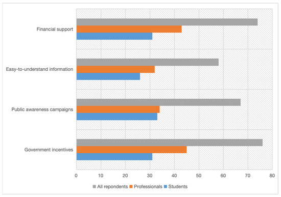 Additionally, 69.72% of respondents pointed out the need for government incentives (76 votes) to stimulate the people of Algeria to choose green buildings, and 61.47% of them voted in favor of public awareness campaigns (67 votes). Financial support, 74 votes (67.89%), and providing easy-to-understand information, 58 votes (53.21%), were the necessary supports (Figure 8).