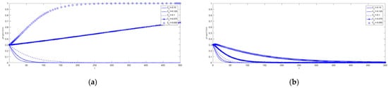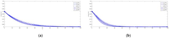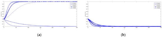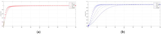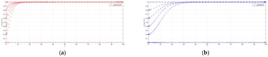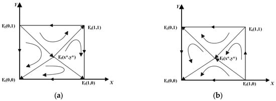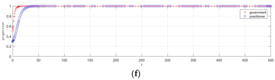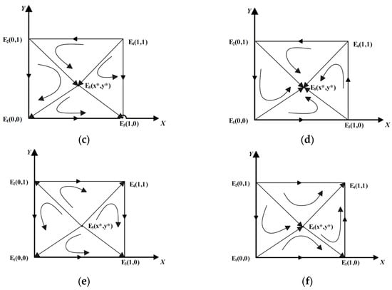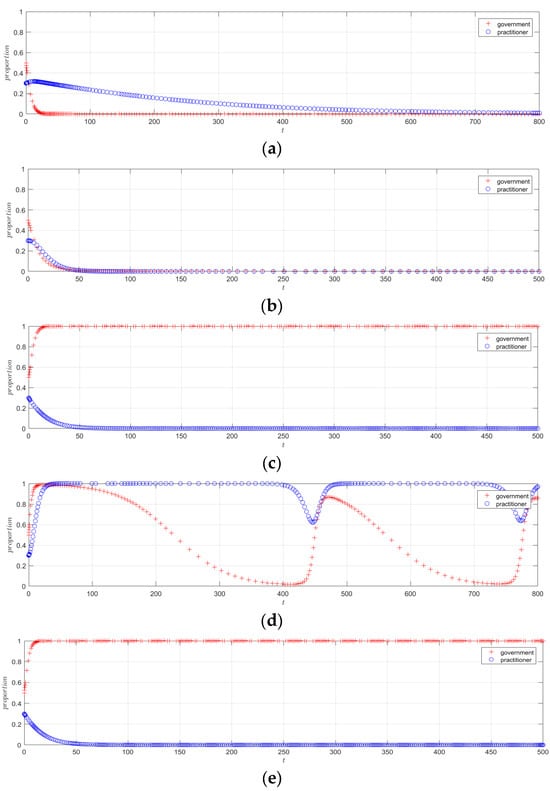 From Equation (6), , and (denoted as ) are the roots of . According to the stability principle, when ,, is ESS (Evolutionary Stability Solution), i.e., the government can achieve local stability by choosing active regulation. When , , at this time for all are stable; when , meets the necessary conditions and is the evolutionary stability point; when , meets the necessary conditions and is the evolutionary stability point. Similarly, for the practitioner subject, , , and (denoted as ) are the roots of . When is , it is a stable state for all ; when is , it satisfies the necessary conditions and is an evolutionary stable point; when is , it satisfies the necessary conditions and is an evolutionary stable point.