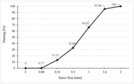 CEN standard sand, adhering to TS EN 196-1 standard [18], served as the fine aggregate in the mortar samples; its granulometry is illustrated in Figure 2.
