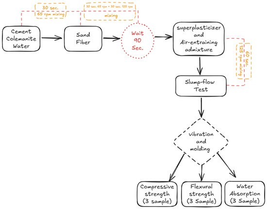 Initially, cement, colemanite, and water were added to the mixing bowl and mixed for 30 s at 65 rpm. Subsequently, aggregates and fibers were incorporated into the mixture, and mixing continued for an additional 30 + 30 s at 65 and 125 rpm. Following this, the mixture was allowed to rest for 90 s. During the resting period, the material adhering to the walls and bottom of the mixing bowl was scraped off, and the water-reducing and air-entraining admixtures were added. After the 90 s waiting period, the mixture was further mixed for 60 s at 125 rpm, resulting in a total mixing time of 4 min. The slump-flow test was conducted immediately after the mixing process without any delay. To evaluate the hardened state properties, the same mixtures were prepared again following the same procedure. A schematic representation of the mixing process is provided in Figure 4.
