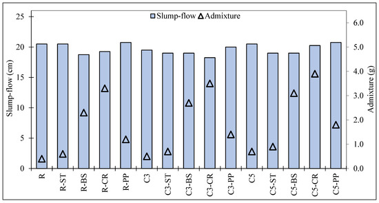The amounts of superplasticizer required to achieve the target slump-flow diameter values (19 ± 2 cm) for the fresh state properties of the mortar mixtures were determined. Figure 5 illustrates the slump-flow values of the mortar mixtures and the corresponding amounts of superplasticizer used.