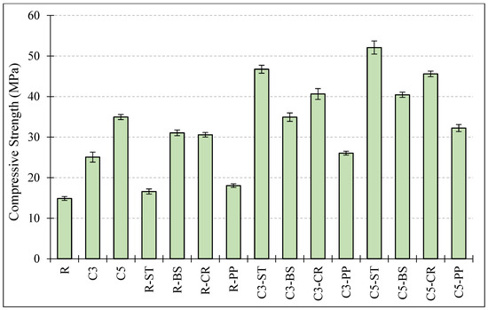 The positive effect of colemanite on compressive strength was also evident in fiber-reinforced mixtures, as shown in Figure 9. When comparing mixtures containing 3% colemanite and fibers (C3-ST, C3-BS, C3-CR, C3-PP) with fiber mixtures without colemanite (R-ST, R-BS, R-CR, R-PP), the greatest increase in compressive strength was observed in steel fiber mixtures. The addition of 3% colemanite (C3-ST) to the steel fiber mixture resulted in an approximately 182% increase in compressive strength. Similarly, the inclusion of 3% colemanite in basalt, carbon, and PP fiber mixtures improved compressive strengths by 12%, 33%, and 44%, respectively.