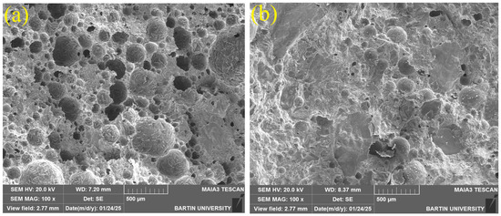Overall, the increased effectiveness of steel fibers in colemanite-containing mixtures can be attributed to the reduced impact of AEA and the improved matrix–fiber adhesion facilitated by colemanite. The diminished effect of basalt and carbon fibers in these mixtures is likely due to weaker matrix–fiber adhesion. This observation aligns with findings by Canpolat et al. [44], who reported that the effectiveness of basalt fiber decreased when used with colemanite.