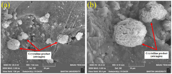 SEM images of the control (R) and C5 samples are shown in Figure 7. The control mixture exhibits more pronounced air bubbles due to the effect of AEA, while colemanite reduces the AEA’s effectiveness in the C5 mixture. SEM analysis confirms that air bubbles are fewer in the C5 mixture compared to the control. Additionally, Figure 8 reveals that the C5 mixture contains significant amounts of crystalline products (e.g., ettringite) in its matrix. Some of the air voids created by AEA are filled with these crystalline products, further contributing to the improved mechanical properties.