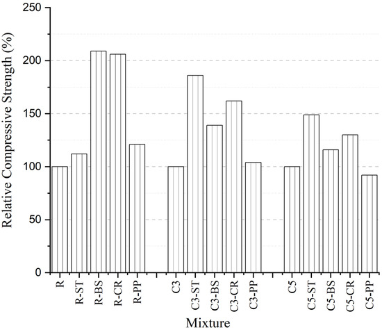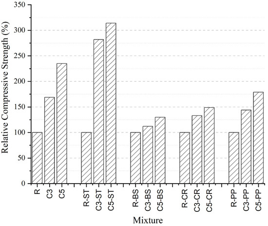 A comparable trend was observed in mixtures with 5% colemanite replacement, where the improvement in compressive strength was even more pronounced than in the 3% colemanite mixtures. For instance, the C5-ST mixture exhibited a threefold increase in strength compared to the R-ST mixture. Similarly, compressive strength improvements of 30%, 49%, and 79% were observed in the C5-BS, C5-CR, and C5-PP mixtures, respectively.
