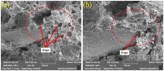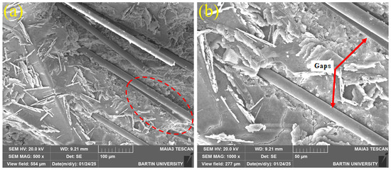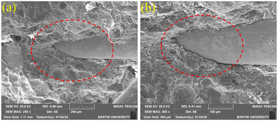 Additionally, voids are observed at the basalt fiber–matrix interface, and some basalt fibers appear to be partially detached from the matrix (Figure 17). These factors likely contribute to the weakened effect of basalt fibers on flexural strength.