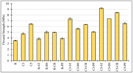 Based on these findings, it was concluded that the addition of basalt and carbon fibers to mortar mixtures without colemanite provided better mechanical properties compared to steel or PP fibers. However, the combination of steel fiber and colemanite resulted in the highest increase in flexural strength. Overall, the combination of colemanite and fiber significantly enhanced the flexural strength of cementitious mixtures. In contrast, PP fiber showed a comparatively lower effect on strength improvement than other fiber types.