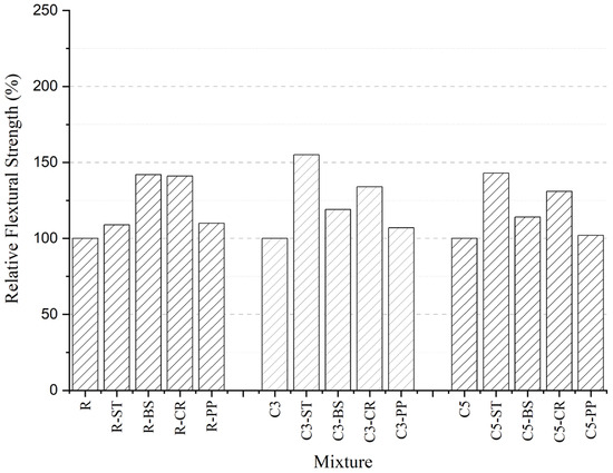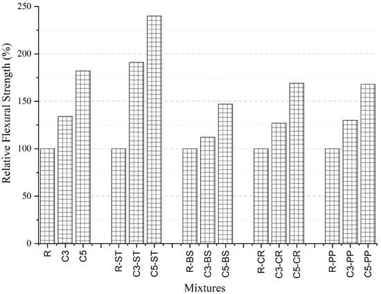 Figure 18 illustrates the relative changes in flexural strength of mortar mixtures containing AEA, categorized by fiber type. Similar to the trend observed in compressive strength, mixtures without colemanite showed greater increases in flexural strength when basalt and carbon fibers were used compared to other fiber types. Specifically, R-BS and R-CR mixtures exhibited increases of 41–42%, while the R-ST and R-PP mixtures showed improvements of approximately 9–10%.
