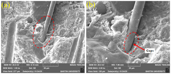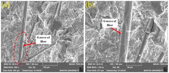 Figure 10 and Figure 11 present SEM images of the control (R-ST) and 5% colemanite (C5-ST) samples containing steel fibers. The SEM images reveal that steel fibers exhibited better adhesion to the matrix in the colemanite-containing samples (Figure 11). In the R-ST samples, gaps were observed at the fiber–matrix interface, which likely weakened the adhesion to some extent. In contrast, these gaps were fewer and more limited in the C5-ST samples. This improved fiber–matrix adhesion is a key factor contributing to the enhanced mechanical properties of the colemanite-containing samples.