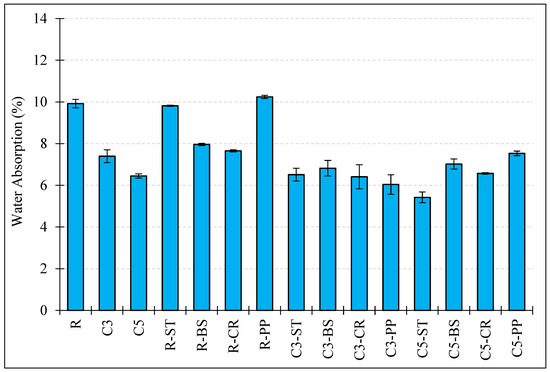 In mixtures without colemanite, the addition of steel and PP fibers had little effect on water absorption. However, a decrease in water absorption was observed with the addition of basalt and carbon fibers. It is well-documented that the addition of fibers to cement-based systems significantly influences water absorption. Previous studies have linked increased water absorption to the formation of voids caused by fiber interlocking during mixing [49,50]. Conversely, in materials with fewer voids, water absorption decreases because water penetration through the sample becomes more difficult [9].