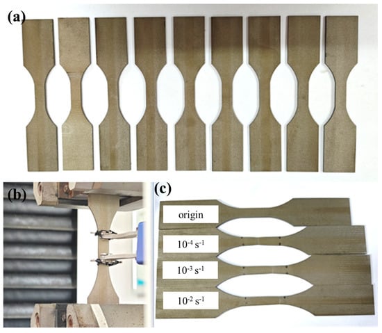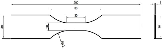 According to the standard “Tensile Test of Metal Materials Part 1: Test method at room temperature” (GB/T 228.1-2010) [35], the plate dumbbell standard specimen used in the test fully considers the influence of the size effect to ensure the accuracy and reliability of the test results. The samples were processed by the electrical discharge cutting method with the dimension which is shown in Figure 1, and the rolling direction was taken as the sampling direction of the sample. The tensile tests of TWIP steel were carried out by a WDW-100 universal testing machine at three different controlled strain rates of 10−4 s−1, 10−3 s−1, and 10−2 s−1. Three tests were carried out at each strain rate to ensure the repeatability of the test.