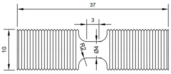 The dynamic tensile sample was processed using the electrical discharge cutting method, with the sampling direction aligned parallel to the rolling direction. According to the standard entitled “High strain rate tensile tests for metallic materials-Part 1: elastic rod type systems” [36], the test adopted a round rod type sample with a total length of 37 mm, and the length of the standard distance segment was 3 mm. The standard thread of 15 mm is processed at the clamping end, and the sample size is shown in Figure 2.