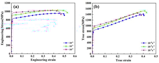 To evaluate the quasi-static mechanical properties of the new TWIP steel, tensile tests were conducted at strain rates of 10−2 s−1, 10−3 s−1, and 10−4 s−1. Figure 3 shows the specimen dimensions and the arrangement of the extensometer during the tests. From the macroscopic image of the specimen after fracture (Figure 3c), it is evident that the material undergoes significant elongation, with no noticeable necking observed at any of the strain rates, indicating good toughness under specified strain rate. The force–displacement curves were converted into stress–strain curves, as shown in Figure 4, which demonstrates the engineering stress–strain and true stress–strain, respectively. Table 2 provides a summary of the mechanical property indices that were obtained, including yield strength, tensile strength, and strength–ductility product. The results indicate that as the strain rate increases, the strength increases, while the yield strength reaches 958.61 MPa at a strain rate of 10−2 s−1. However, the elongation shows a decreasing trend but remains above 30%. The strength–ductility product, a crucial indicator of the material’s overall mechanical performance, exhibits a similar pattern, first declining and then rising to a peak value of 67,608 MPa%.