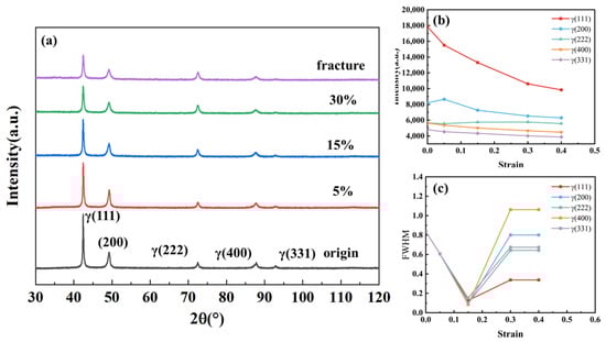 (a) XRD patterns; (b) peak intensity; (c) FWHM of TWIP steel at different strains.