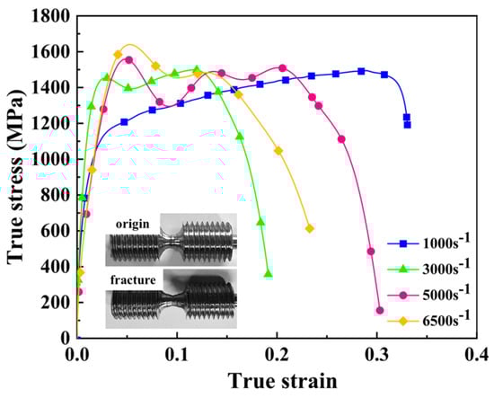 The SHTB tests of the TWIP steel were carried out at different strain rates, from which the true stress–strain curves as well as the basic mechanical property indexes of the material under dynamic loading were obtained; the true stress–strain curve is shown in Figure 6, the basic mechanical property indexes are shown in Table 3. Comparing the macroscopic photos of the original specimen and the fractured specimen, it can be seen that the length of the specimen increased after dynamic stretching, and there is no obvious necking phenomenon near the fracture area, which indicates a uniform plastic deformation took place within the scaled section. The PSE results of TWIP steel show that the material can still maintain high energy absorption characteristics even at a high strain rate, especially at a strain rate of 5000 s−1.