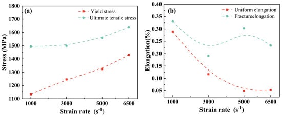 Figure 7 illustrates the strain rate dependence of mechanical properties for the investigated material. The yield strength demonstrates a positive strain rate sensitivity (PSRS) [40], exhibiting a monotonic increase with increasing strain rates. However, the of the material decreased during the high strain rate transition from 3000 s−1 to 5000 s−1, as shown in Figure 7a. A comparison of elongation rates under different strain rates reveals that both uniform elongation and fracture elongation exhibit similar trends, decreasing overall with increasing strain rates, which is shown in Figure 7b. However, within the range of 3000~6500 s−1, the elongation rates show a notable increase at 5000 s−1, with both uniform elongation and fracture elongation rising at this specific strain rate.