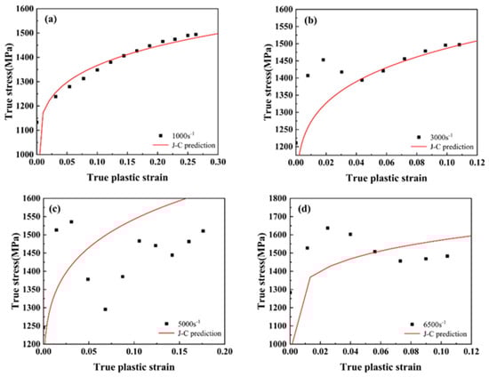 Comparison of experimental data and J-C model predictions at different strain rates. (a) 1000 s−1; (b) 3000 s−1; (c) 5000 s−1; (d) 6500 s−1.