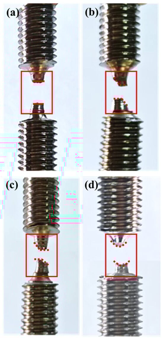 Macroscopic fracture images of TWIP steel at different strain rates. (a) 1000 s−1; (b) 3000 s−1; (c) 5000 s−1; (d) 6500 s−1.